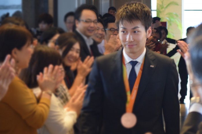 東京都千代田区の株式会社NTTドコモで10月3日、同社人事部に勤務するリオデジャネイロ・パラリンピック競泳男子50メートル自由形(S9)で銅メダルを獲得した山田拓朗(25)が報告会を行った。