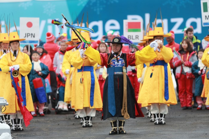 練習からの交通状況で戻れながった選手も多くいたが、セレモニーでは、踊りや民謡など韓国伝統的なダンス、義足や片足のダンサーによる踊りが行われ、暖かく迎えられた。