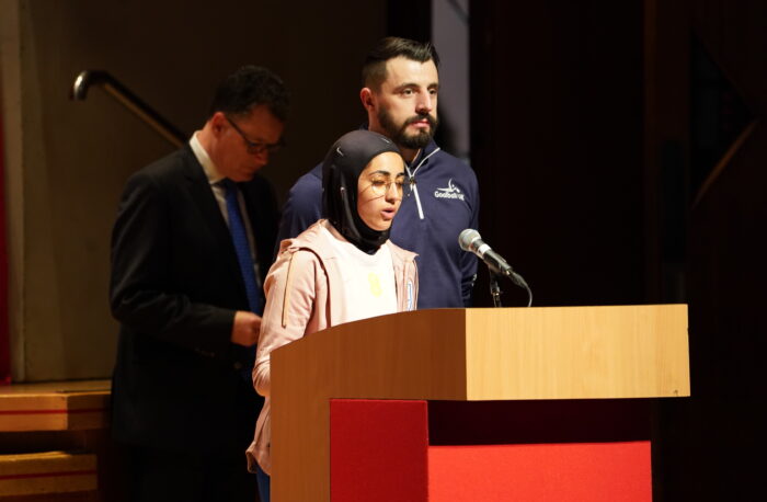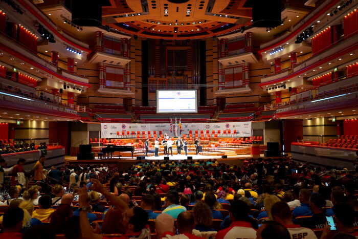 バーミンガム市長Cllr Chaman Laiによる歓迎のスピーチ、視覚障害者で構成されたInner Voice Orchestraによるアンサンブルの演奏にのせて、参加70カ国の国旗がボランティアに運ばれてステージに入場した。