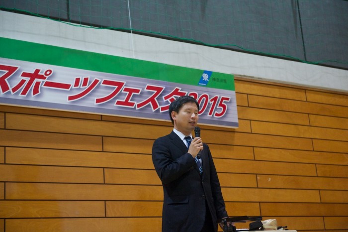 最初に講演が行なわれ、今回からオリンピアンも参加。長距離ランナーの渡辺康幸氏がマラソンの強化などについて話した。