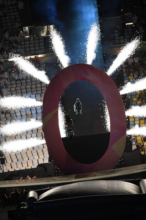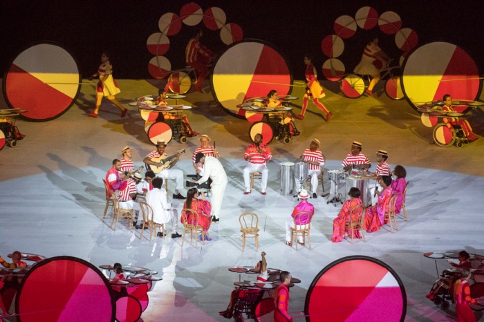 その後ピアニストのジョアオ・カルロス・マーティンによるブラジル国歌の演奏が始まると、色とりどりのパラソルが集結しブラジル国旗を形成した。マーティンは指が萎縮していく障害などにより一度はピアノ奏者を辞めたものの、絶え間ない努力により再びピアノの前に戻ってきた経歴をもつ。