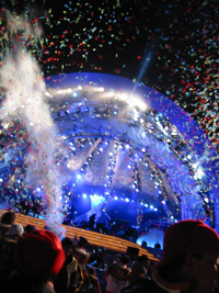 閉会式、10日間の全てが終了。 16日19時30分。2002年ソルトレークパラリンピックの閉会式がダウンタウンの会場で始まりました。ステージには開会式の日に灯された火が現れ、国名が読みあげられると、各国の旗手がステージの前を行進して行く。車椅子の旗手もいる。おそらく、ここに集まった人々の多くが、一つひとつ、その国の競技シーンを思い出しているのだ。パラリンピックの旗が下ろされる。SLOCより4年後のトリノのパラリンピック組織委員会へと手渡される。儀式は無事終了。フィナーレは選手、監督、ボランティアが入り交じって音楽に身体を任せ、楽しく語り合い、笑い会った。どこの国、競技、立場に関わらず、声をかけ、記念写真を撮ったり取られたり。この無邪気な喜びを、次のトリノへの力にしよう!(佐々木) ●それぞれの閉会式。 ○閉会しておもうこと(隈元ダイゴ) 冬の夜空に華やかな花火が弾け、パラリンピックのロゴデザインをかたどった紙吹雪が無数に舞う。選手たちは思いおもいに歌い踊り、オリンピック・メダルプラザに集まった数千人の観衆とともに最後の式典を楽しんでいた。こうしてソルトレークパラリンピックは幕を閉じた。 壇上の大画面では、この10日間をフラッシュバックしていた。映し出される開会式や競技の映像が変わるたびに、ここでの日々をおもいだす。思えば長いようで短いようで。どちらとも言いようがないが、とにかく色々なことを考えた。だが現場では取材やニュースの更新などでアタマがいっぱいで、腰を据えて追究することがままならなかったのも事実である。帰国したら、ゆっくりと自分なりの総括をし、障害者スポーツを見直したいとおもう。トリノに向けて。 ○重圧から開放された選手たちの笑顔があふれた閉会式。(荒木美晴) 寒空の下で行われた一夜の宴をもって、 10日間の日程をすべて終了した。 会場には、選手やスタッフをはじめ大会に携わったボランティアの姿も。 3分間にまとめられたソルトレークパラリンピックの トリビュートビデオが流れると、 観客たちは白い息を吐きながら、大きな拍手と歓声を 主役たちに捧げた。 長野からソルトレーク、そしてトリノへ。