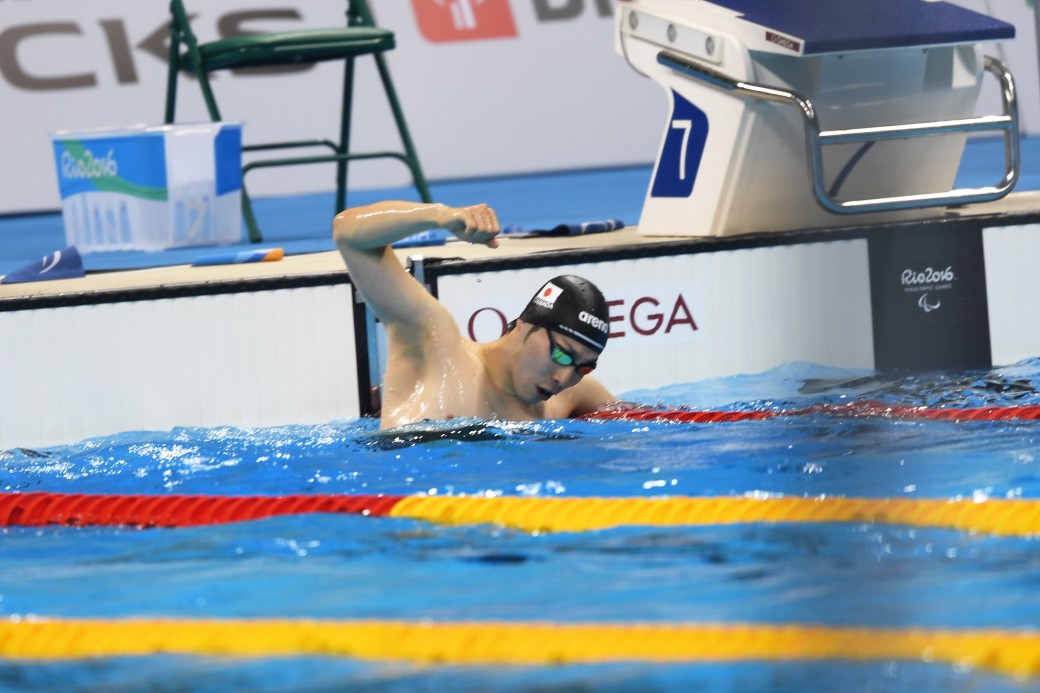 山田拓朗、50メートル自由形(S9)のゴール後 写真・西川隼矢
