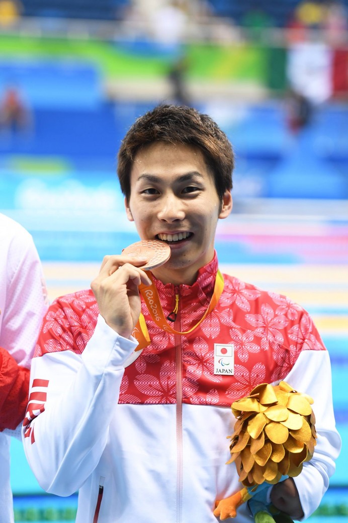 50メートル自由形(S9)で銅メダルを獲得した山田拓朗の表彰式 写真・西川隼矢