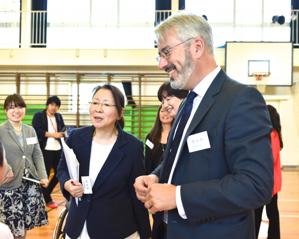 子供たちと歓談するIPC教育委員会のニック・フラー委員長