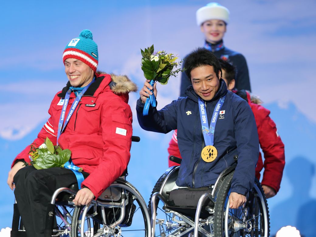 回転(男子)シッティングクラスメダルセレモニー会場をあとにする。左からRABL Roman(AUT)、鈴木猛史(JPN)(写真:比嘉優樹)