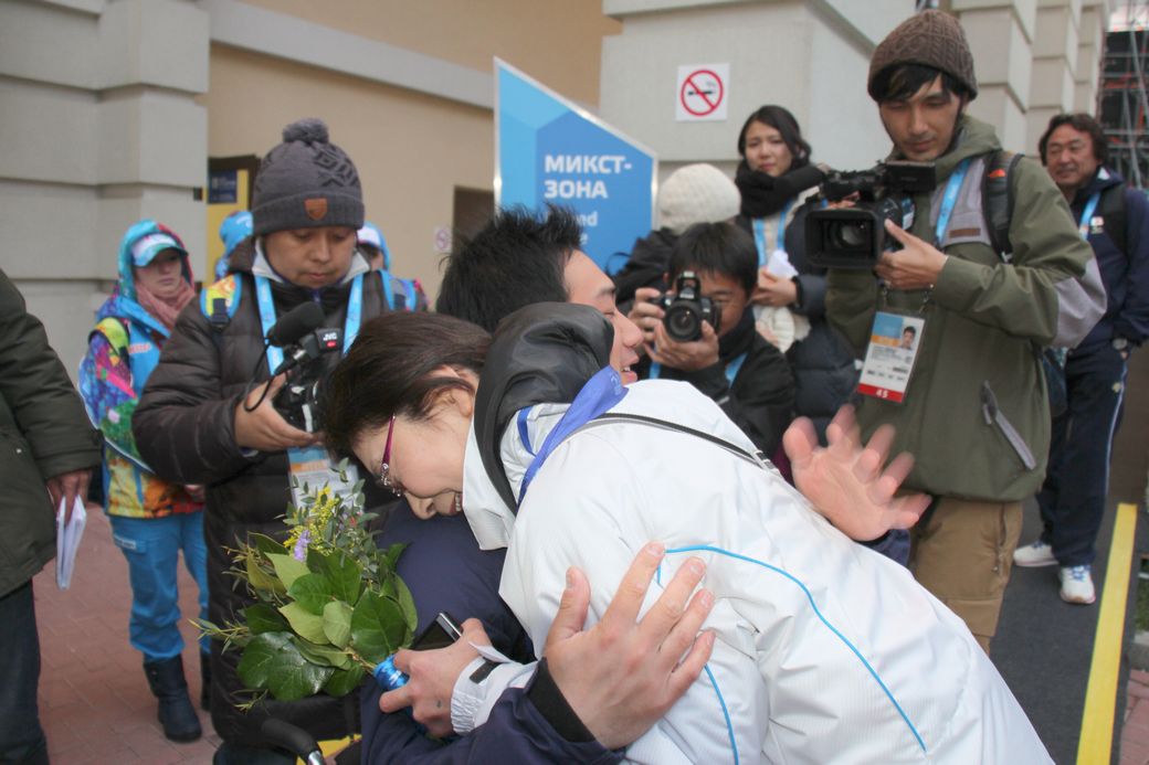 回転(男子)シッティングクラスメダルセレモニー後、福島から駆けつけた母弘子と3大会越しの金メダルをねぎらう(写真:比嘉優樹)