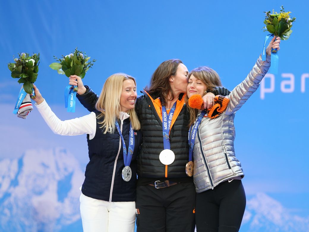 新種目スノーボード(女子)のメダルセレモニーにて。左よりHERNANDEZ EP CERVELLON Cecile (FRA)、MENTEL-SPEE Bibian(NED)、PURDY Amy(USA)(写真:比嘉優樹)