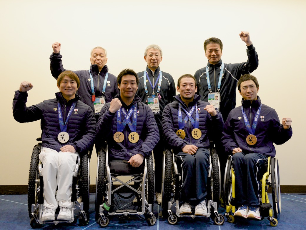 解団式。ソチパラリンピック日本選手団メダリストとスタッフ。左上から丸山監督、荒木団長、荒井監督。左下から森井、鈴木、狩野、久保