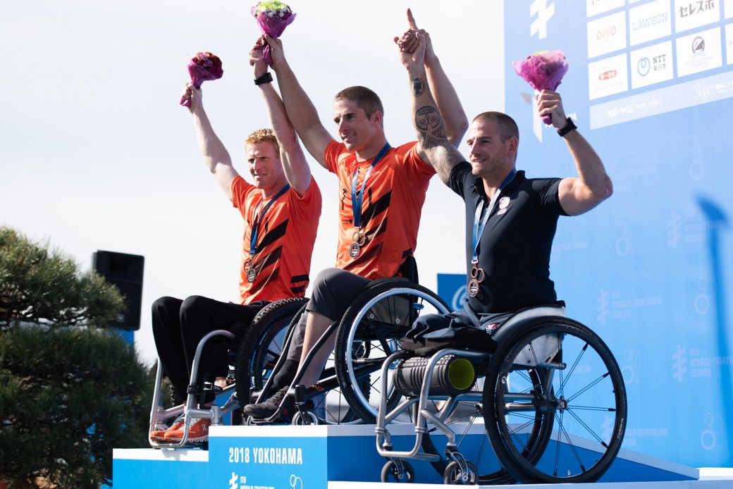 PTWC表彰式。1位イェツェ・プラット(オランダ)、2位ヘールト・スキパー(オランダ)、3位ジョセフ・タウンゼント(イギリス) 写真・秋冨晢生