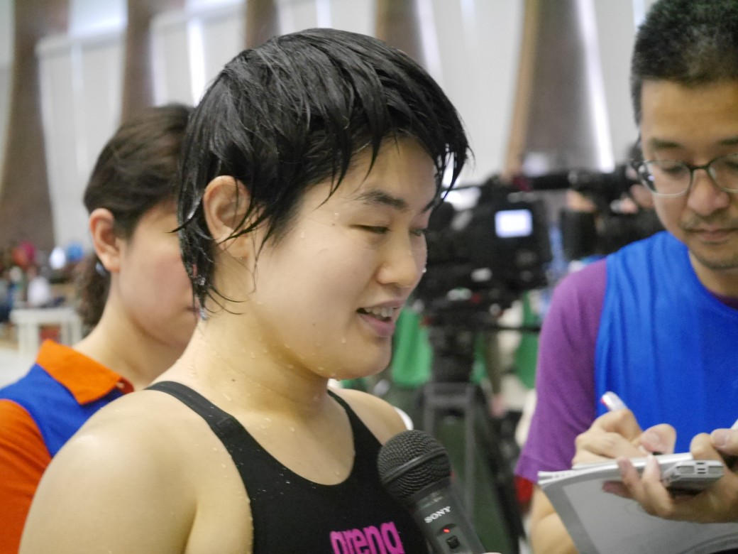 ミックスゾーンでの石浦智美(全盲/伊藤忠丸紅鉄鋼) 写真・望月芳子