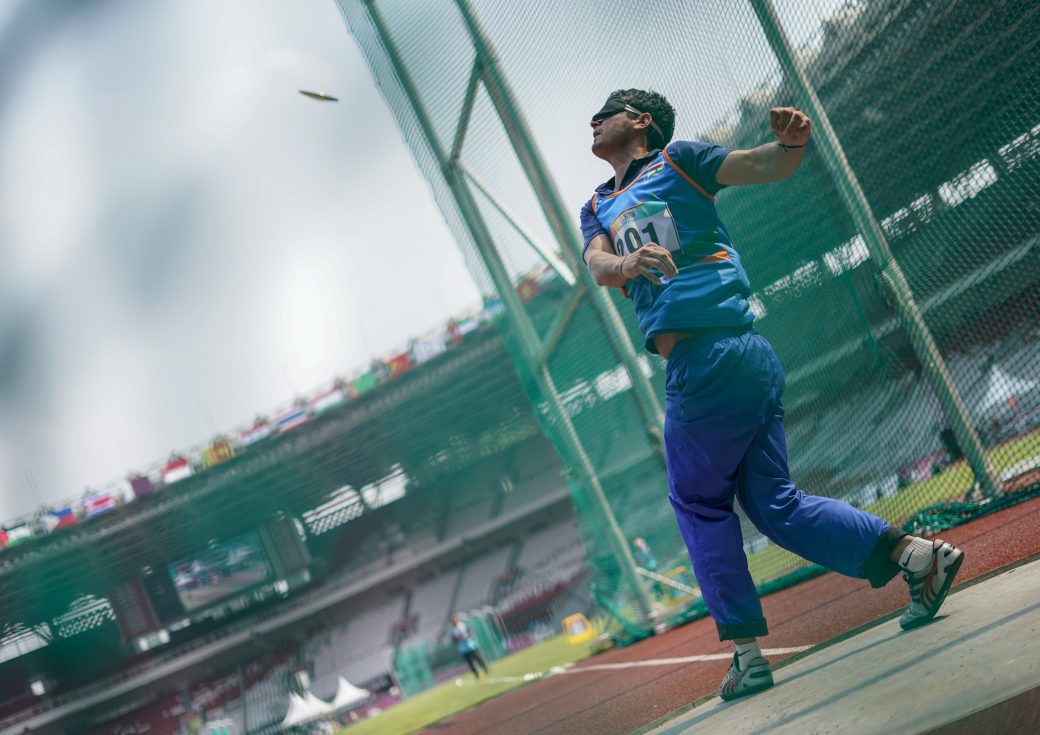 説明:ガイドが方向を指示し、投擲の構えに入る。健常の円盤投げと同じように回転投げで勢いよく円盤を投げる。ゲージを抜けて、円盤は放物線の軌道を描く。