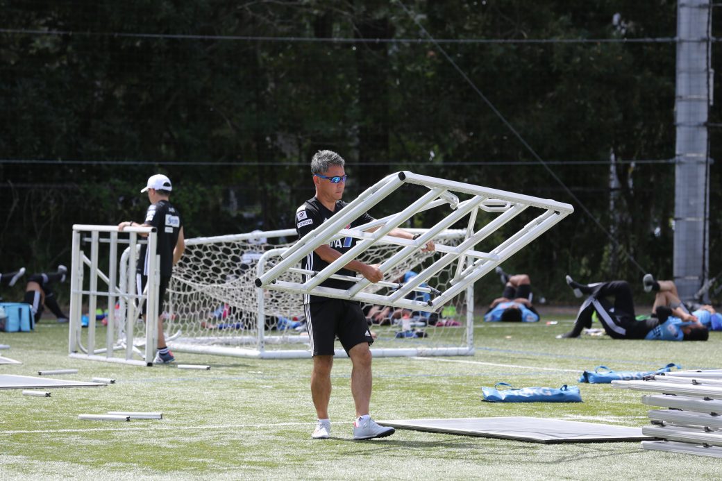 練習後ボランティアと一緒に片付けをする監督、スタッフたち