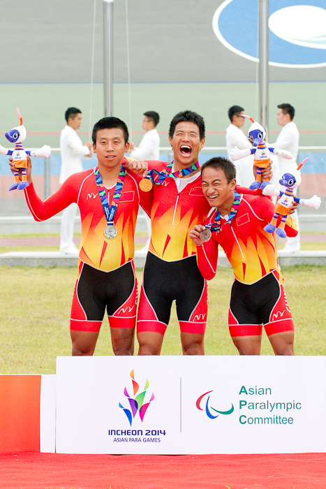 1kmタイムトライアル[男子C1-5]。左からリウ・シンヤン(C5)、リ・チャンユ(C1)、シェ・ハオ(C2)。男女とも幅広いクラスに世界トップ級選手を揃える中国が表彰台を独占した