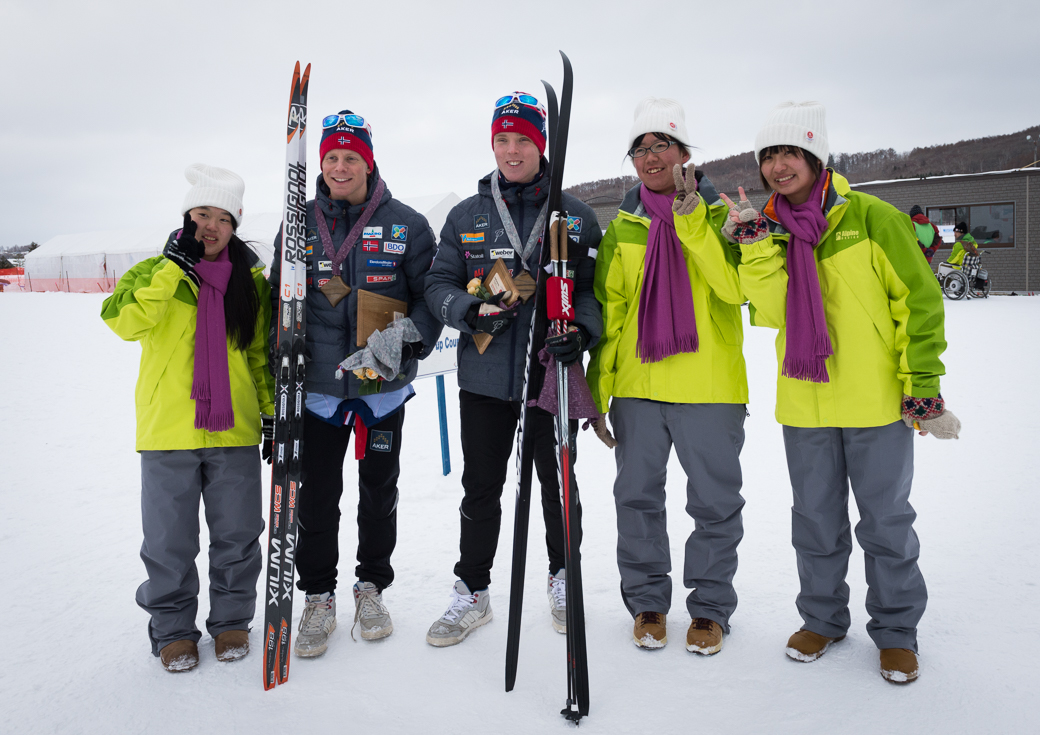 視覚障害クラスで優勝したアイリク・バイ(ノルウェー19歳)とガイドを囲んで写真撮影。セレモニーでアテンドを担当する北海道雨竜高等養護学校の学生ボランティア