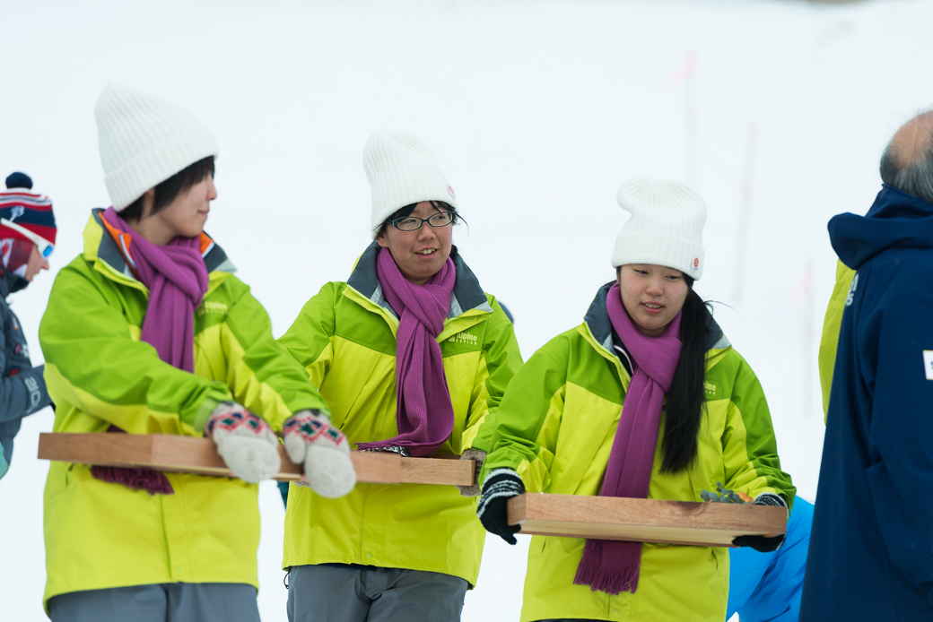メダルセレモニーのお手伝いをする北海道雨竜高等養護学校の学生ボランティア