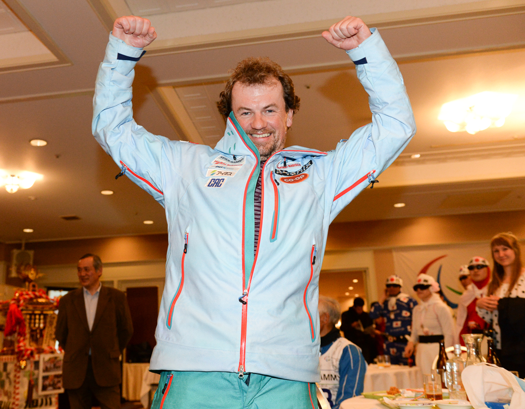 プレゼントされた日本選手団のウエアを着てポーズするTD