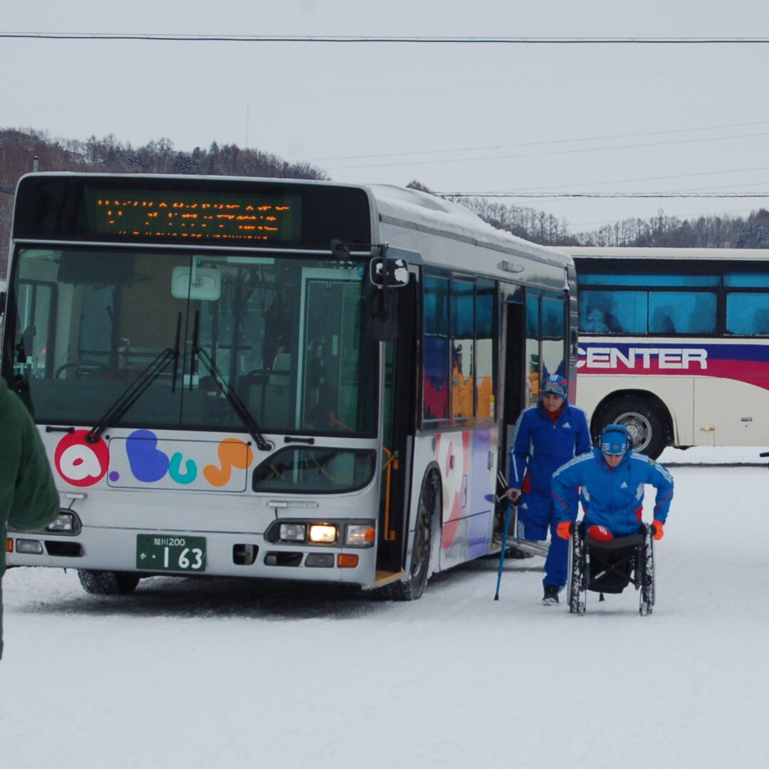 市街と会場を結んだシャトルバスは旭川電気軌道(株)提供のノンステップバス。同社は1997年、全国に先駆けてノンステップバスを大量導入したことで知られる、福祉にも熱心な会社 (撮影:星野恭子)