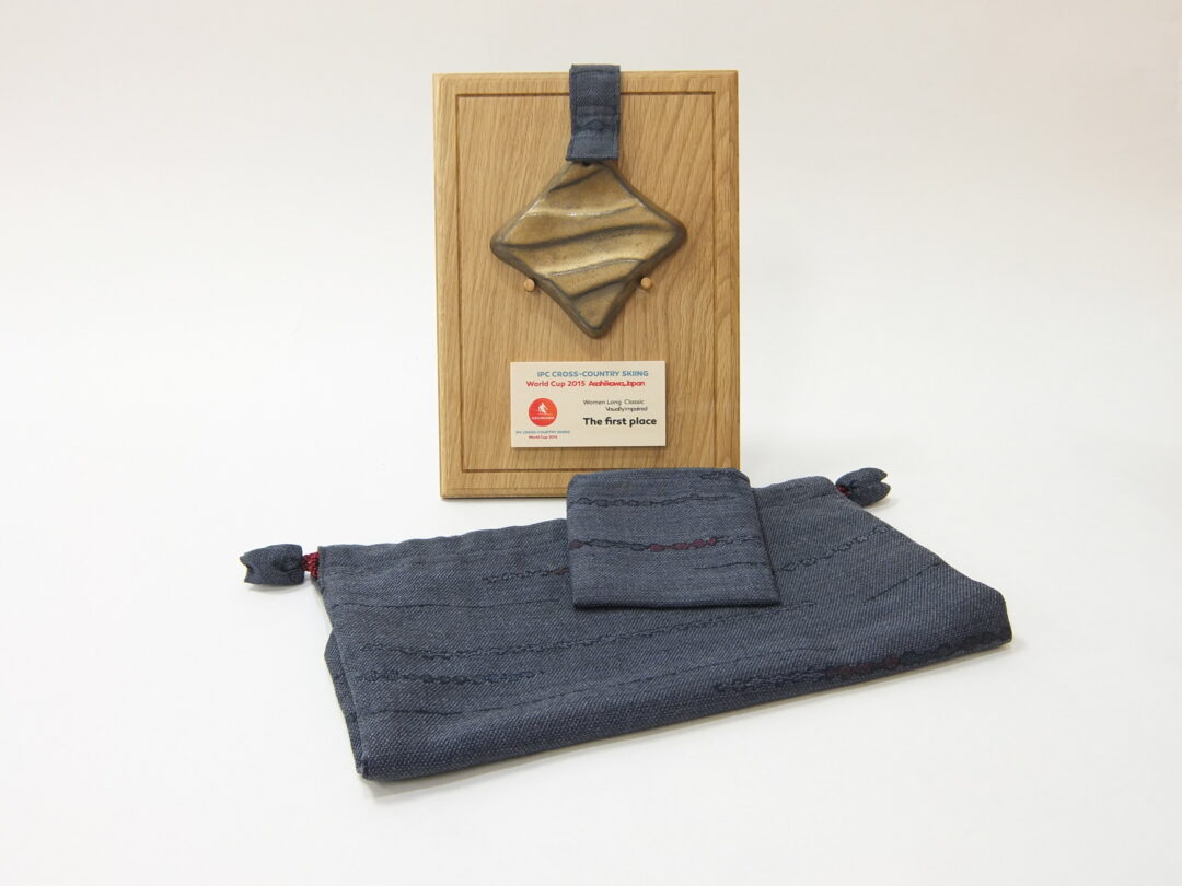 北海道の大地を模した菱形に、石狩川と忠別川を表すラインを配した陶器製のメダルと、ディスプレイ用盾と収納袋のセット (写真提供:NPO法人 カムイ大雪バリアフリー研究所)