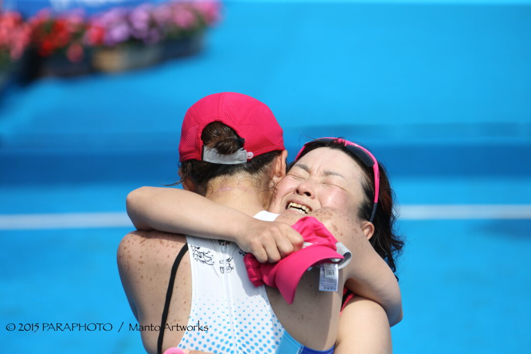 5月17日、エイジパラにはじめて盲ろうの選手が出場。スプリントディスタンンスをガイドとともに完走した中田鈴子とガイドの箱谷幸恵のフィニッシュ (写真:中村真人)