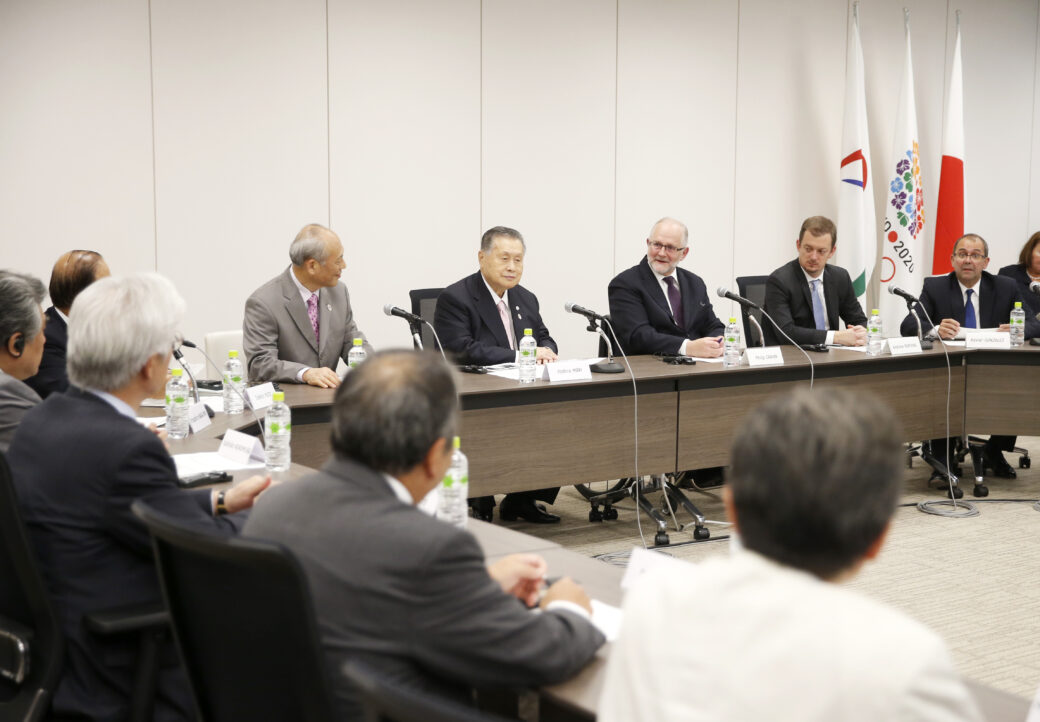 左手から舛添要一知事、森喜朗会長、フリップ・クレイバン会長、アンドリュー・パーソンズ副会長、パピエル・ゴンザレスCEO(写真提供:東京オリンピック・パラリンピック競技大会組織委員会/竹見脩吾)