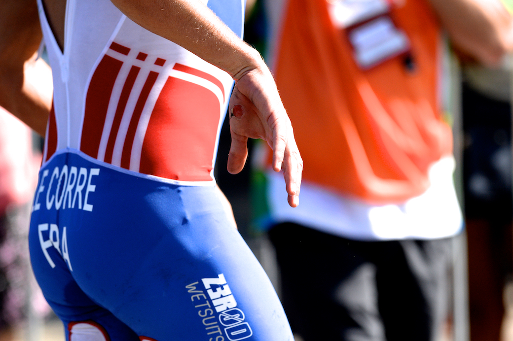 バイクで転倒したフランスの選手。手の皮をすりむいた