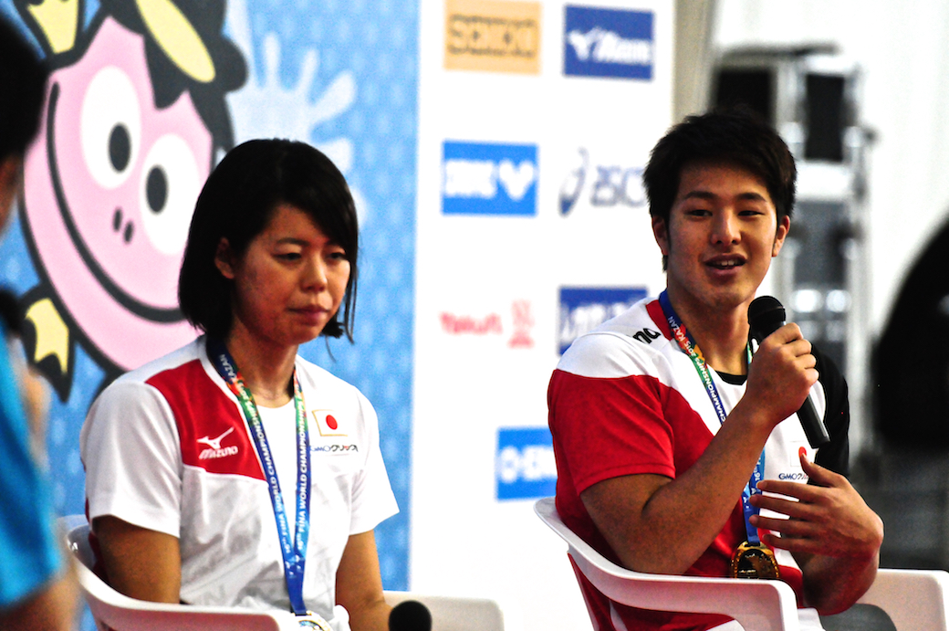 金メダリスト瀬戸大也(右)と星奈津美(左)のトークショー