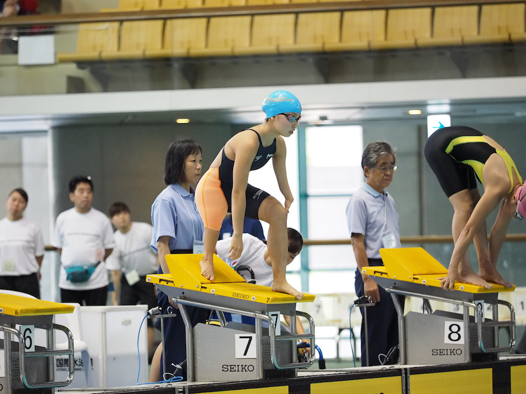 女子100メートル平泳ぎSB7のスタート。西田杏(左上腕欠損・右足大腿骨欠損/峯村PSS東京)