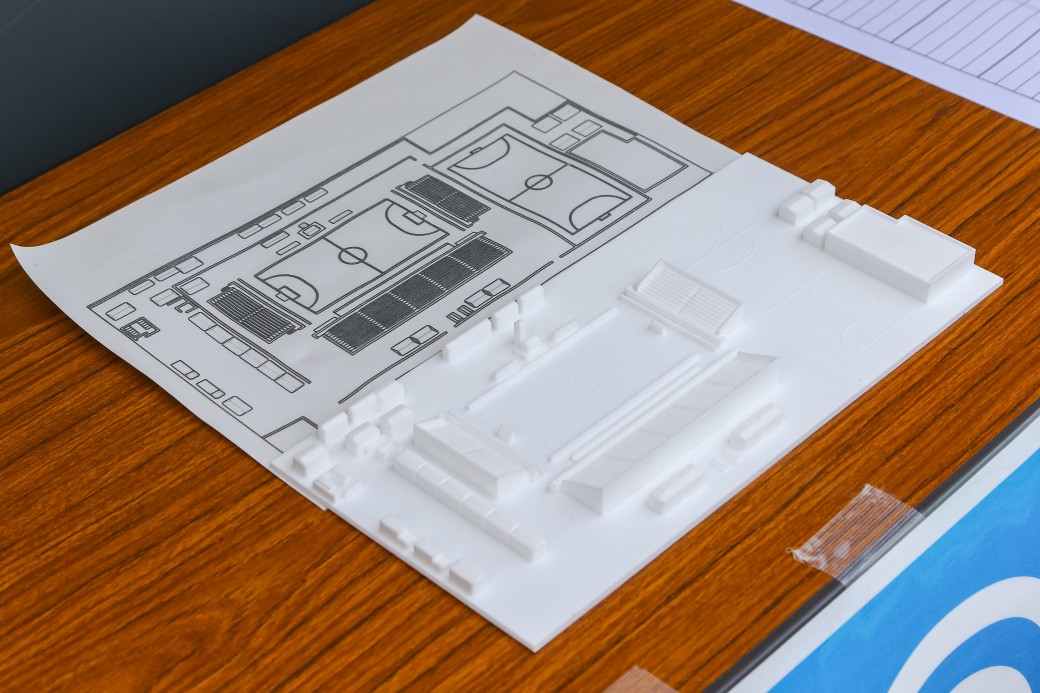 奥・触地図、手前・3D スケールモデル 写真提供:日本ブラインドサッカー協会
