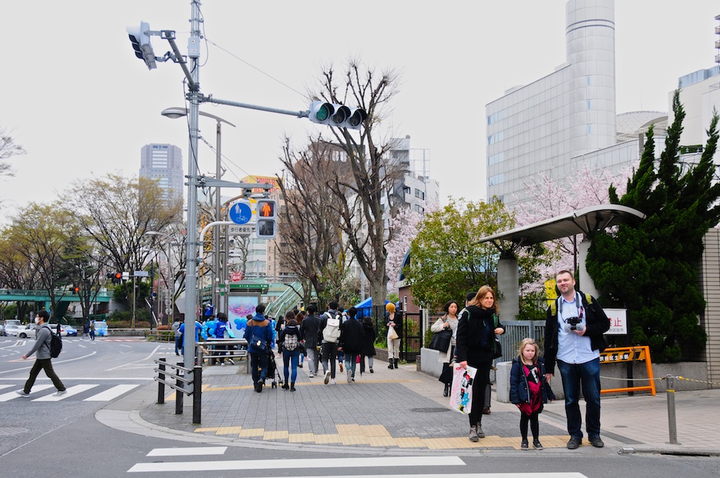 曇り空の肌寒い明治通公園前。前方にブルーが見えている
