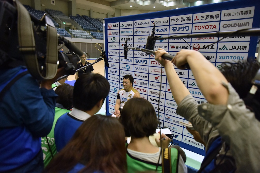 試合後のインタビューを受けるキャプテン、池透暢(3.0) 写真