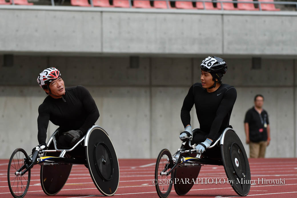 1500メートルT54を終えた樋口政幸(左)と鈴木朋樹