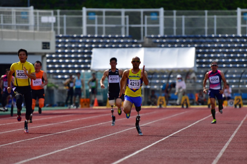 100メートルT42のレース。3レーンを走る山本篤(スズキ浜松AC)