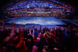 民族衣装(チマチョゴリ)で早くから会場に集まり、さまざまな国旗を手に多くの選手へエールを贈る韓国の人々