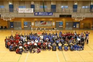 横浜F・マリノスカップ 第15回電動車椅子サッカー大会、決勝戦を戦った横浜クラッカーズ、FCクラッシャーズの選手と大会スタッフ一同 (写真・内田和稔)