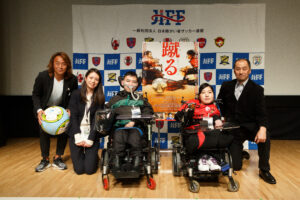 設立記者会見に出場した障がい者サッカー連盟の選手と北澤豪会長