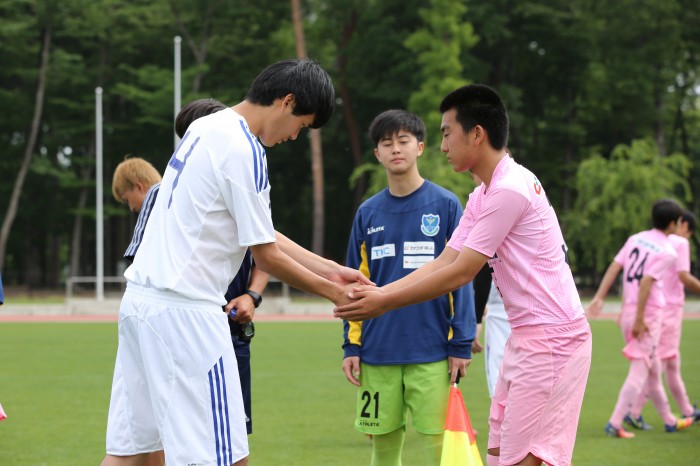 握手をするゲームキャプテン(左)白いユニフォームが知的障がい者サッカー日本代表 (右)ピンクのユニフォームが栃木SCユース