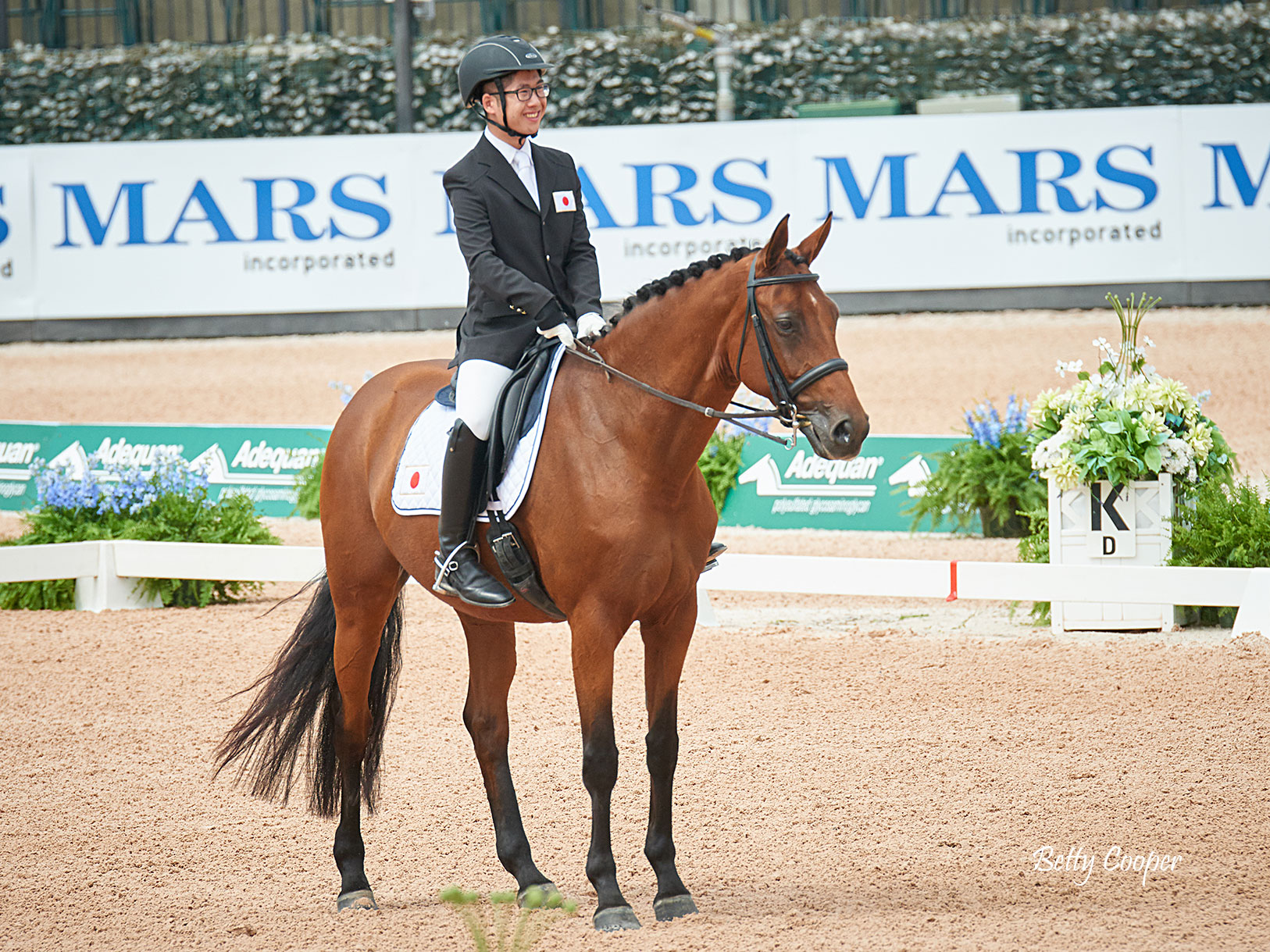 このグループ、一番手に登場した個人・金メダリストコンビ、Sophie Wells&C Fatal Attraction( 11歳 / セン / KWPN)が77.233%の高得点を記録。世界選手権史上最高得点に届くかという勢いで、王者イギリスらしいスタートを切った。