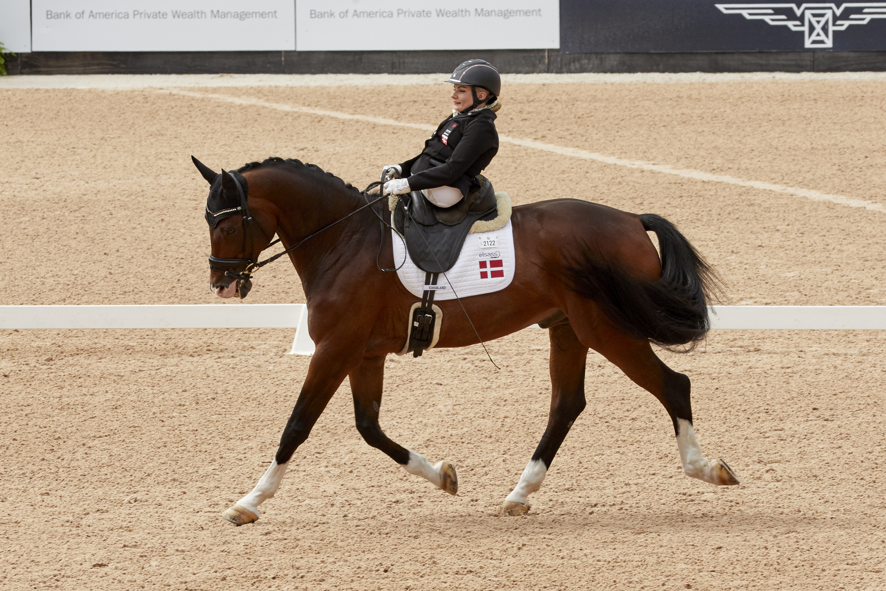 トップライダーは個人金メダリスト・Stinna Tange Kaastrup&Horsebo Smarties(17歳 / セン / DWB)。笑顔で登場した後、チャンピオンらしく活気ある、安定した演技を披露。前半から8点台が多くつくスコアで、74.848%を記録した。