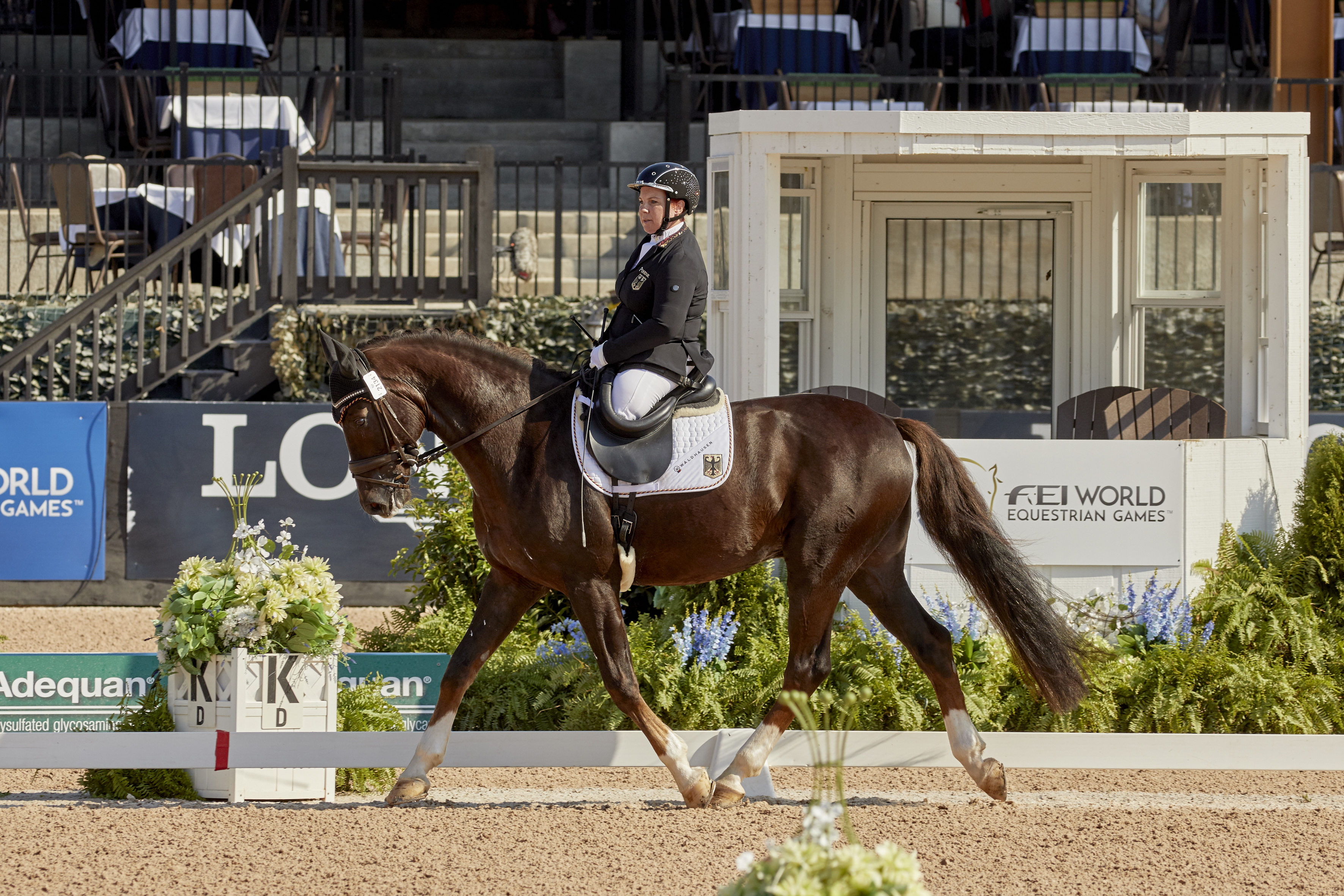 続いて登場したのは7番手、ドイツ・Dr. Angelika Trabert&Diamond’s Shine(8歳/ セン / WESTF)。後肢旋回などの経路中間でやや評価の低い項目があったものの挽回し、最終的に70.235 %を記録。残るドイツの2人馬に繋げた。