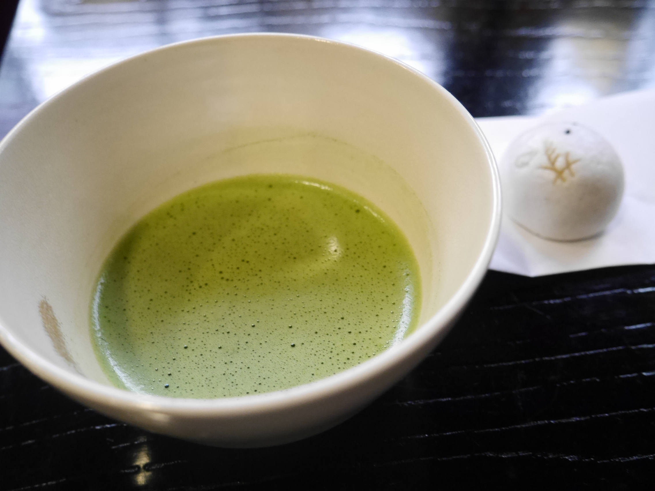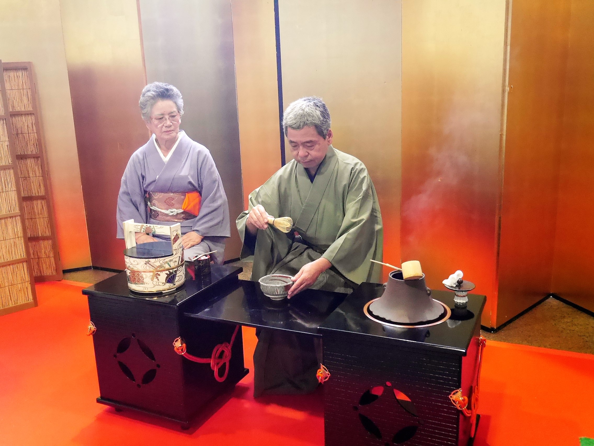 金屏風に赤い毛氈(もうせん)、その前にしつらえられたお茶席で、美しい着物姿の女性たちが運んでくれた抹茶と和菓子をいただく。