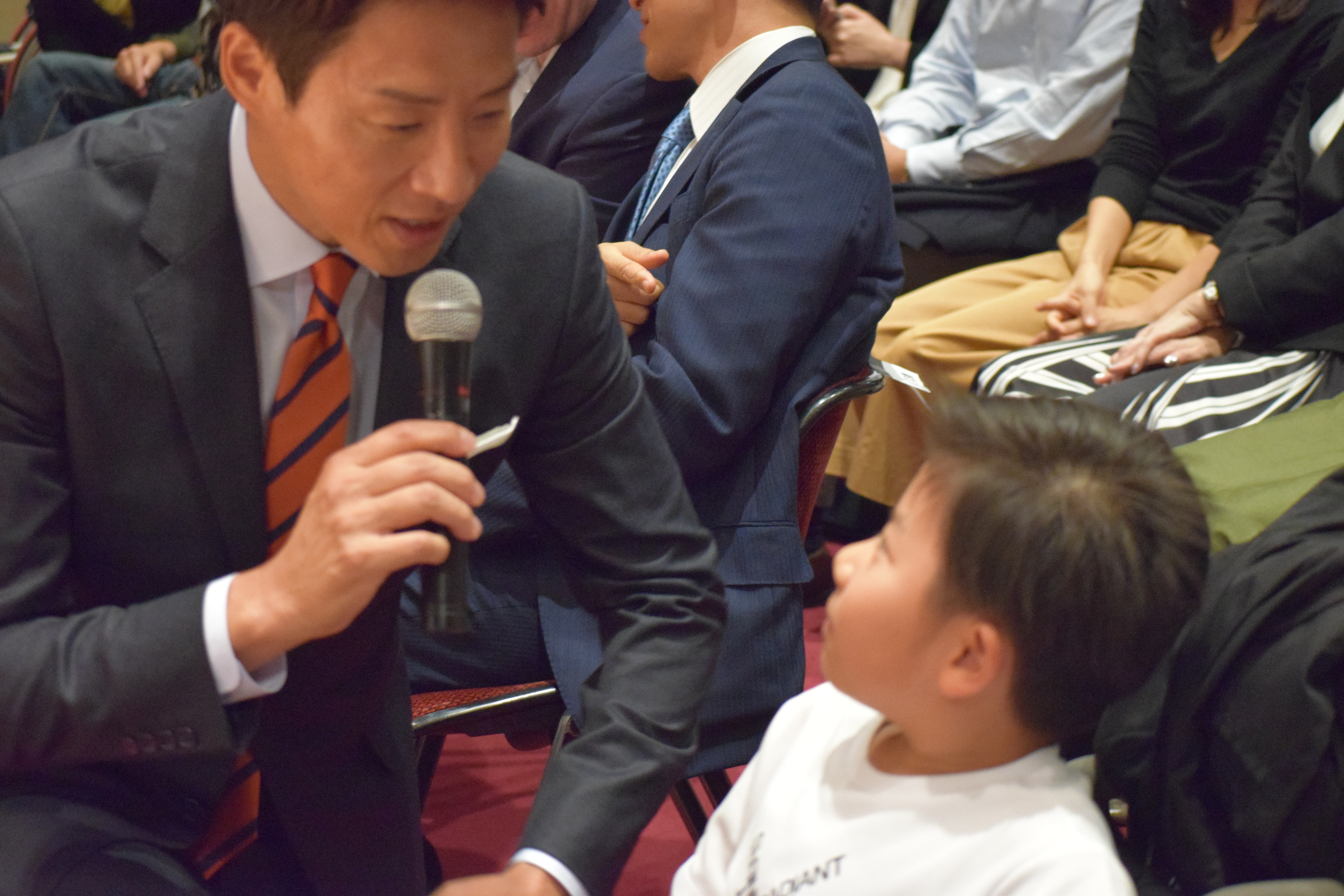 両親と車いすで来場し、一番前の席になった賀川統馬くん(8歳)は車いすバスケットをやっていて、アンダーソンからポストカードとCDをプレゼントされた。「今日は全部楽しかった。これからも、いろいろなスポーツにチャレンジしたい」と話してくれた。