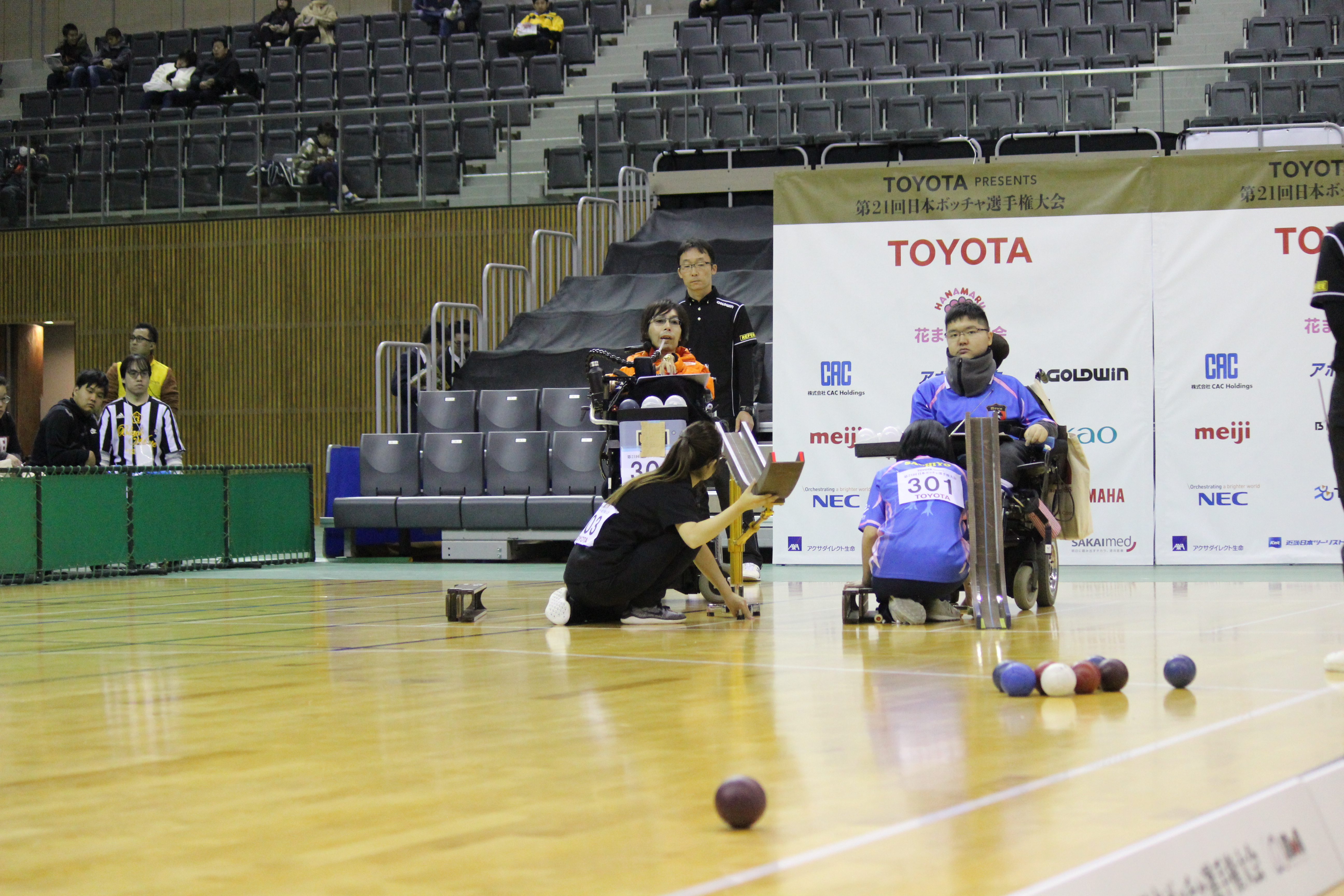 河本は、そのわずかなスペースを見逃さない。自分の赤球左半面を狙いプッシュ、押し出された赤球は右斜めへ進み、右奥のジャック手前のスペースでピタリと止まる。観客席から漏れるため息。まさにミリ単位の攻防が続く。有田はランプ最上段からウルトラハードを転がしその赤球にヒット、奥にあるジャックボールをさらに奥へと動かす。続く有田の5投目、スローイングボックス右端ぎりぎりから絶妙にコントロールされたウルトラハードが自らの青球をプッシュ、押された青球はそのままジャックボールに密着した。大きなどよめき、「ナイス」という声、そして拍手が静かな会場に響き渡る。有田からも珍しく「よっしゃー」という声が漏れ出た。1球1球局面が変わり目が離せない。この時点で河本は残り2球、有田は1球。河本が最上段からウルトラハードをリリース、青球にプッシュし奥の赤球をジャックに寄せるものの、この時点では依然として有田の青球がニアボール。有田の青球はジャックボールに隙間なく密着しているが、河本の赤球とジャックの間にはわずかな隙間があり、有田1点リードの状況。しかし河本は最後の投球で、見事にその隙間を埋めた。このまま終われれば両者が1点ずつ分け合い、河本の優勝が決まる。有田はスローイングボックスを離れ局面を確認。ジャックボール、赤球、青球が密着した状態だ。狙いは手前の青球に当てて奥の赤球をジャックボールから少しでも離す。残り8秒、リリースされ密集の中に進んでいったボールが狙い通り青球に当たる。