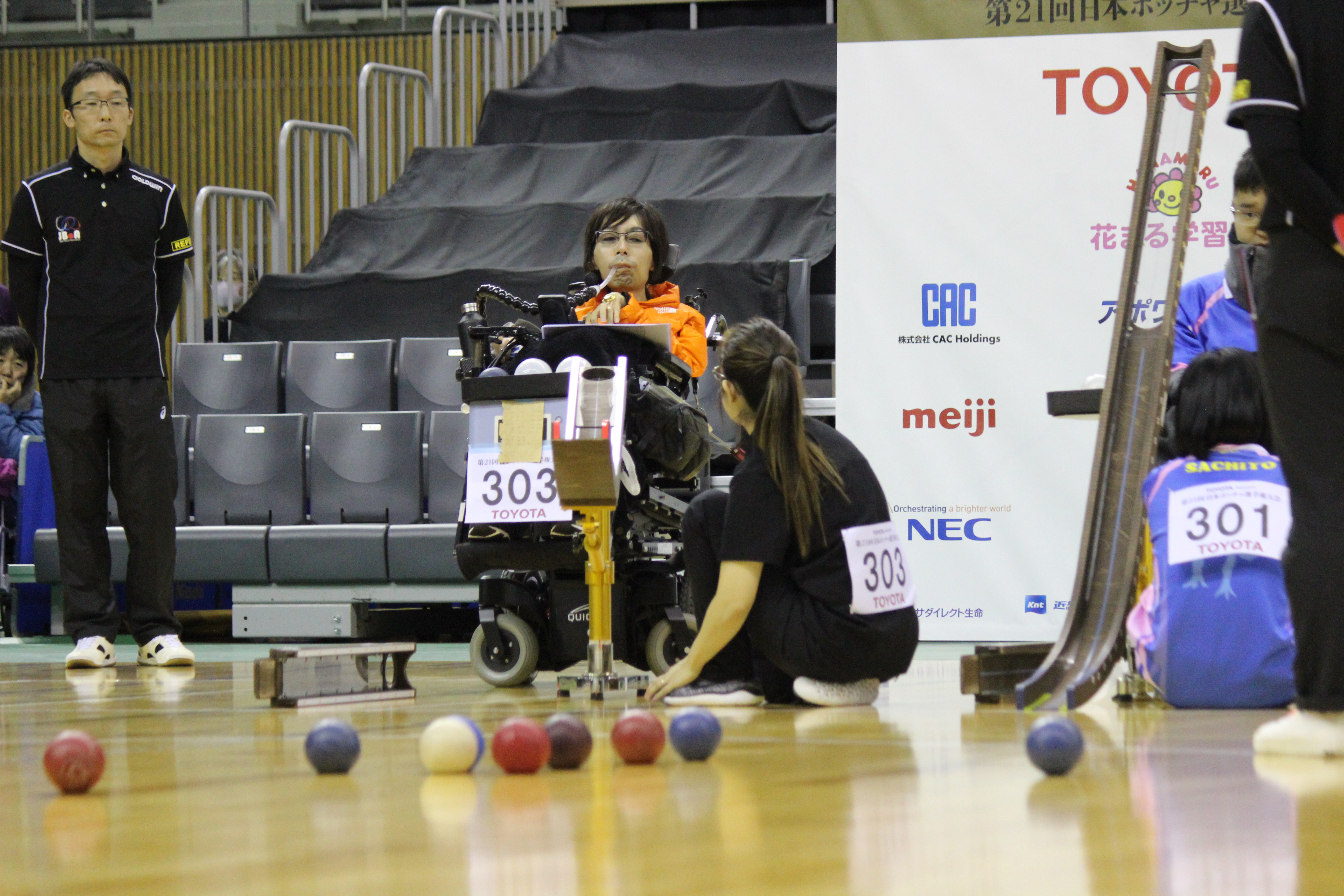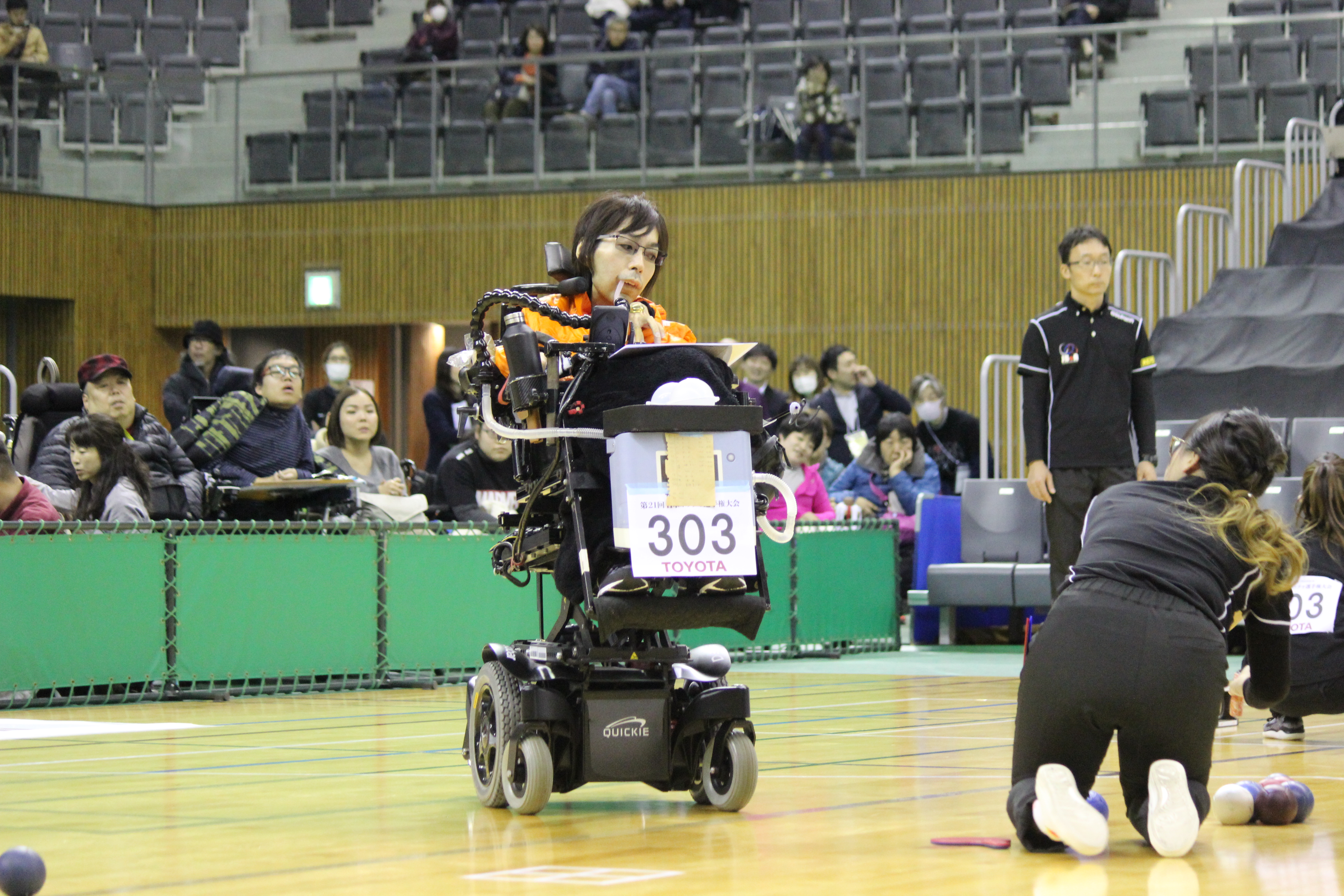 もう1つ越えなくてはならない関門は、地元愛知の河本圭亮。(アシスタントは母の幸代さん)。河本は自らの手で投げるBC4クラスの選手として小学校3年からボッチャを始め2011年の日本選手権では2位にもなったが、筋ジストロフィーの進行とともに最重度のBC3クラスに転向。日本選手権2連覇中、世界ランキング17位の選手である。