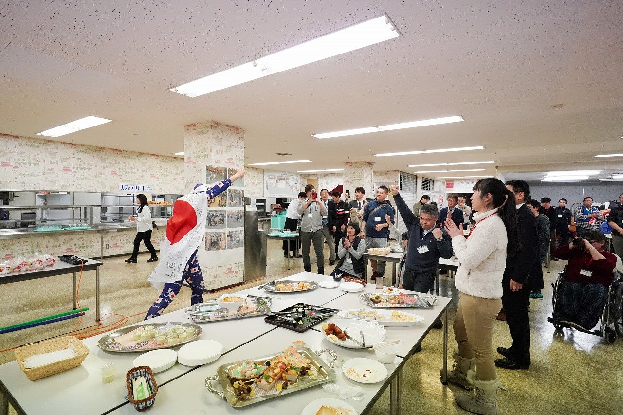 日程の合間には懇親会が開催され、集まった研修会参加者、運営スタッフ、地元の体験参加者、メディアなど、パラスポーツに関心ある人々全員が情報交換した。また、旭川のお酒や食べものに加え、ユニークなコミュニティづくりに寄与するパラスポーツ応援団長「ニッポンマン」の登場や応援グッズの缶バッジが配られた。この2日間で、旭川地域のユーモア溢れるパラスポーツ・ムーブメントに触れることができた。