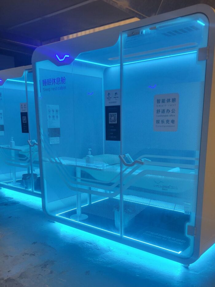 中にはリクライニングベッドがあり、アプリで高さを調整できる。