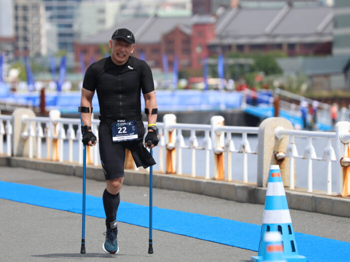 大腿切断の新井はスイム・バイク・ランの3種目を2時間1分18秒で完走。スイムでは筋肉が攣りそうになりながらも泳ぎきり、ランではクラッチ(松葉杖)で太陽の下を駆け抜けた。