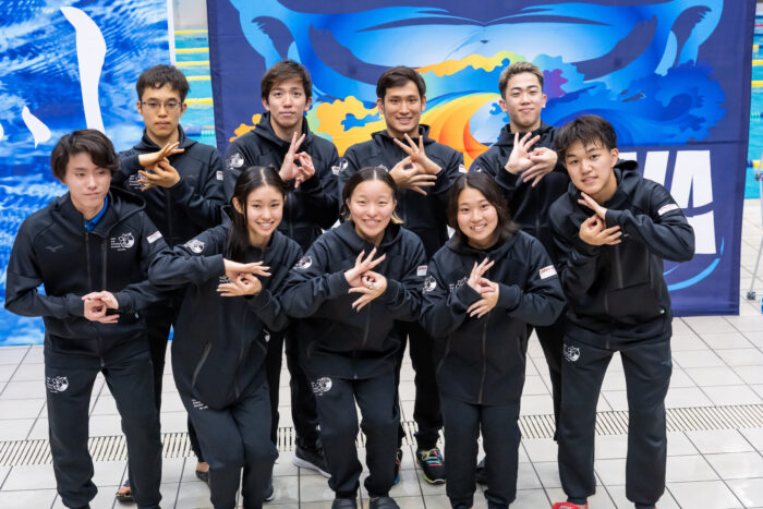 大会2日目、8月のVirtus(知的・ダウン症)世界選手権(タイ)、9月のパラ水泳世界選手権(シンガポール)、11月の東京デフリンピックへ出場予定の日本代表選手団が、プールサイドで観客に紹介された。