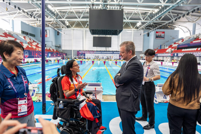 この日は、テレサ・ゴー(シンガポールのパラリンピックメダリスト、スイマー)による、「バックヤードツアー」も行われ、OCBCアクアティックセンター、VIPエリア、ファンゾーン、観客用バリアフリー設備、チーム準備エリアなど、パーソンズ会長とともに詳しく内覧した。