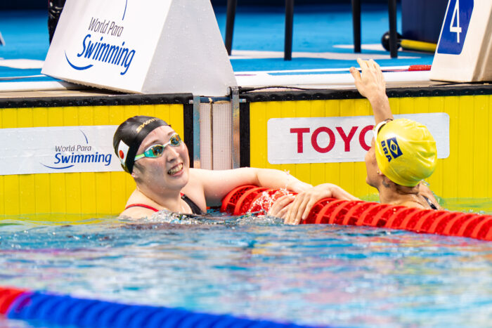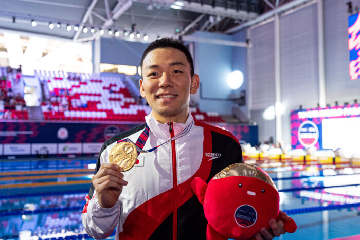 「今回は、いつもより緊張していました。金メダルをとらなきゃって気持ちが強かった」と心境を明かした。そして、「本番にも強くなれるよう練習のほうもするし、この大会を経験に次もがんばっていきたい」パリのリベンジについては「もう、そこを意識していた」と語った。隣のレーンを泳いでいたパリ大会2位のジェーク・ミシェル(MICHEL Jake/AUS)について、「横から見るとダイナミックな動きだなって」と冷静に分析した。